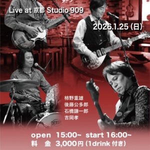The Pepperland Live at 京都Studio909 1/25(SUN) 日時:2026.1.25(Sun) The Pepperlandメンバー:柿野重雄、後藤公多郎、石橋謙一郎、吉岡孝 場所:Studio 909 住所:〒615-8191 京都市西京区川島有栖川町149-1 TEL:075-392-4161 交通:阪急京都線桂駅 徒歩5分 開場:15時00分 演奏:16時~ 料金:チャージ3,000円 ワンドリンク付き ... 1月 25日 (日) 3:00 PM - 7:00 PM Studio 909