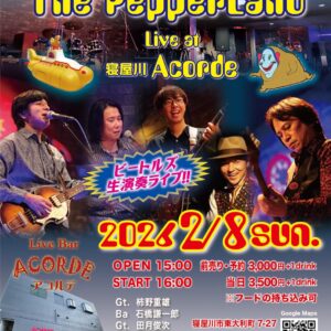 The Pepperland Live at 寝屋川ACORDE 2/8(SUN) 日時:2026.2.8(Sun) the Pepperlandメンバー:柿野重雄、石橋謙一郎、田月俊次、吉岡孝、宮尾卓 場所:Live Bar ACORDE (https://www.liveacorde.com) 住所:572-0042 寝屋川市東大利町7-27 TEL::072-813-7500 交通:京阪寝屋川市駅徒歩3分 開場:15時00分 演奏:16時~ 料金:前売り、予約3,000円 当日3,500円(別途ドリンクオーダー必要) ※フードの持ち込みは自由です。 ... 2月 08日 (日) 3:00 PM - 7:00 PM Live Bar ACORDE572-0042 寝屋川市東大利町7-27